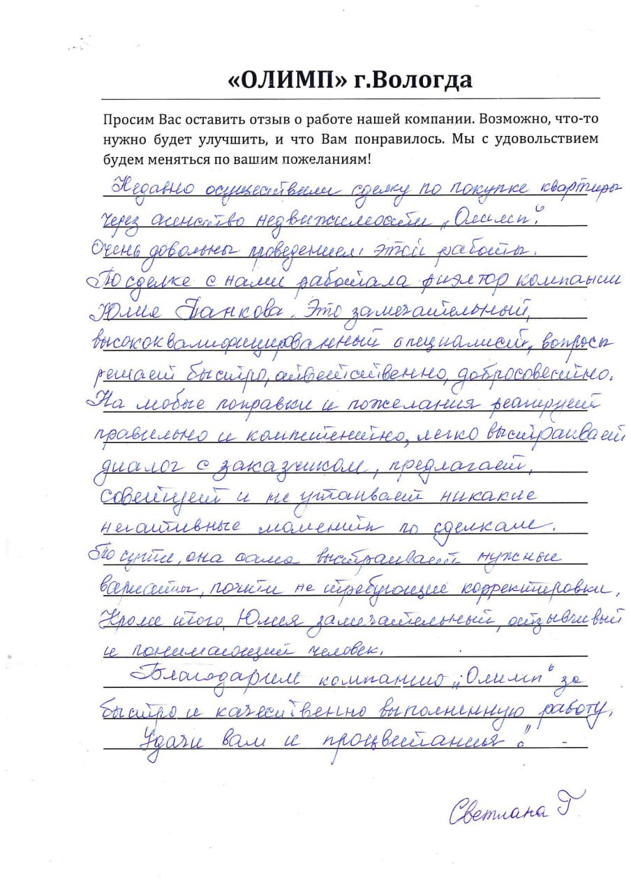 Недавно осуществили сделку по покупке квартиры через агентство недвижимости «Олимп». Очень довольны проведением этой работы. По сделке с нами работала риелтор компании Юлия Панкова. Это замечательный, высококвалифицированный специалист, вопросы решает быстро, ответственно, добросовестно. На любые поправки и пожелания реагирует правильно и компетентно, легко выстраивает диалог с заказчиком, предлагает, советует и не утаивает никакие негативные моменты по сделкам. По сути, она сама выстраивает нужные варианты, почти не требующие корректировки. Кроме того, Юлия замечательный, отзывчивый и понимающий человек.