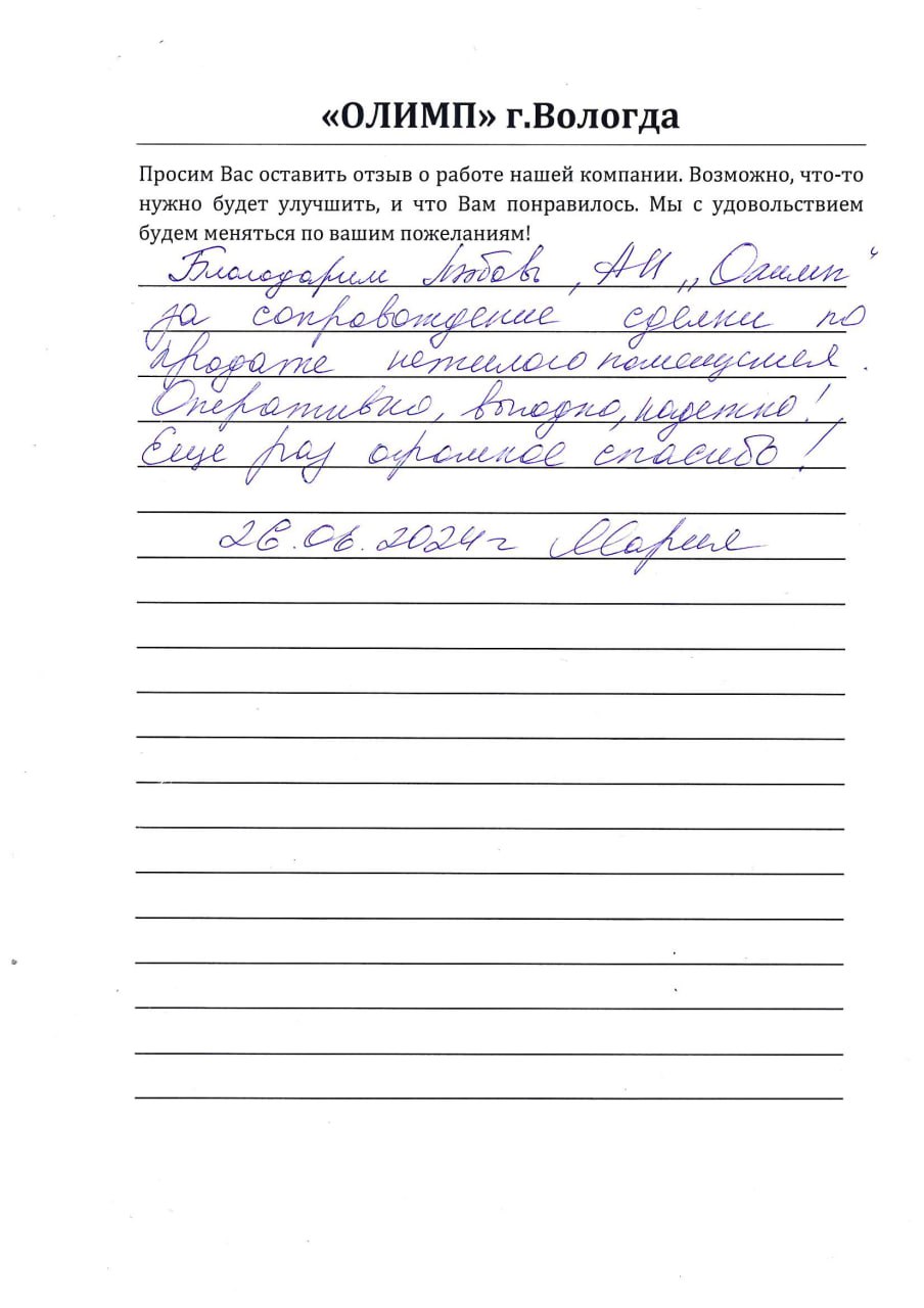Благодарим Любовь, АН "Олимп" за сопровождение сделки по продаже нежилого помещения. Оперативно, выгодно, надежно! Еще раз огромное спасибо!